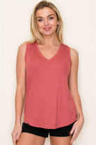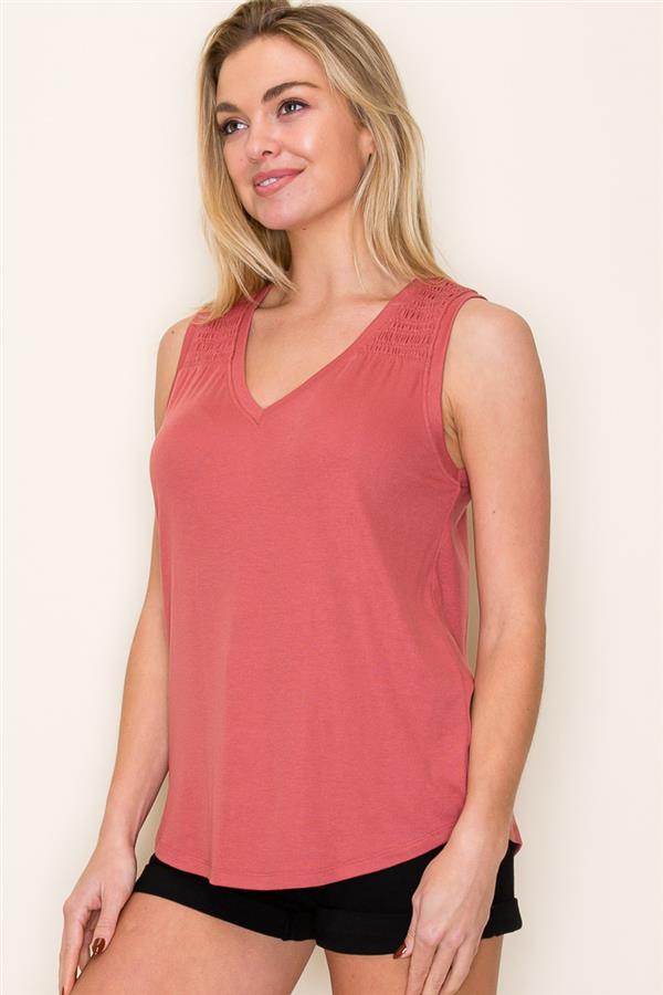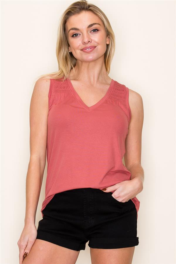Experience timeless style and comfort with this Smocked Shoulder V-Neck Sleeveless Top. Crafted from high-quality terracotta fabric, this top features a flattering V-neck and trendy smocked shoulder details.