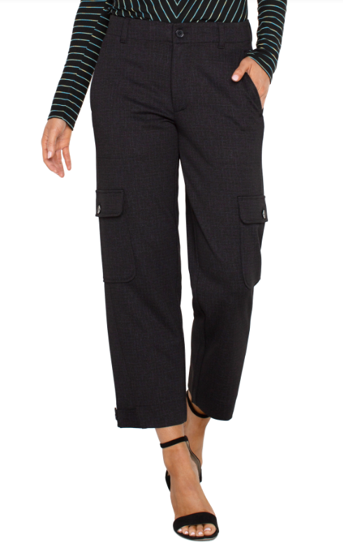 Indulge in the perfect fit with these Utility Crop Tab Hem Knit Cargo Pants in classic black from Liverpool.