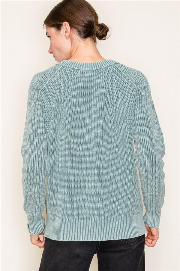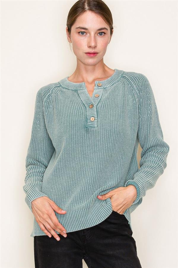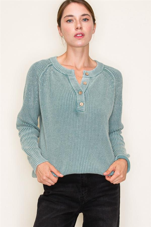 Washed Yarn Henley Neck Half Button Sweater, Dark Mint | Staccato