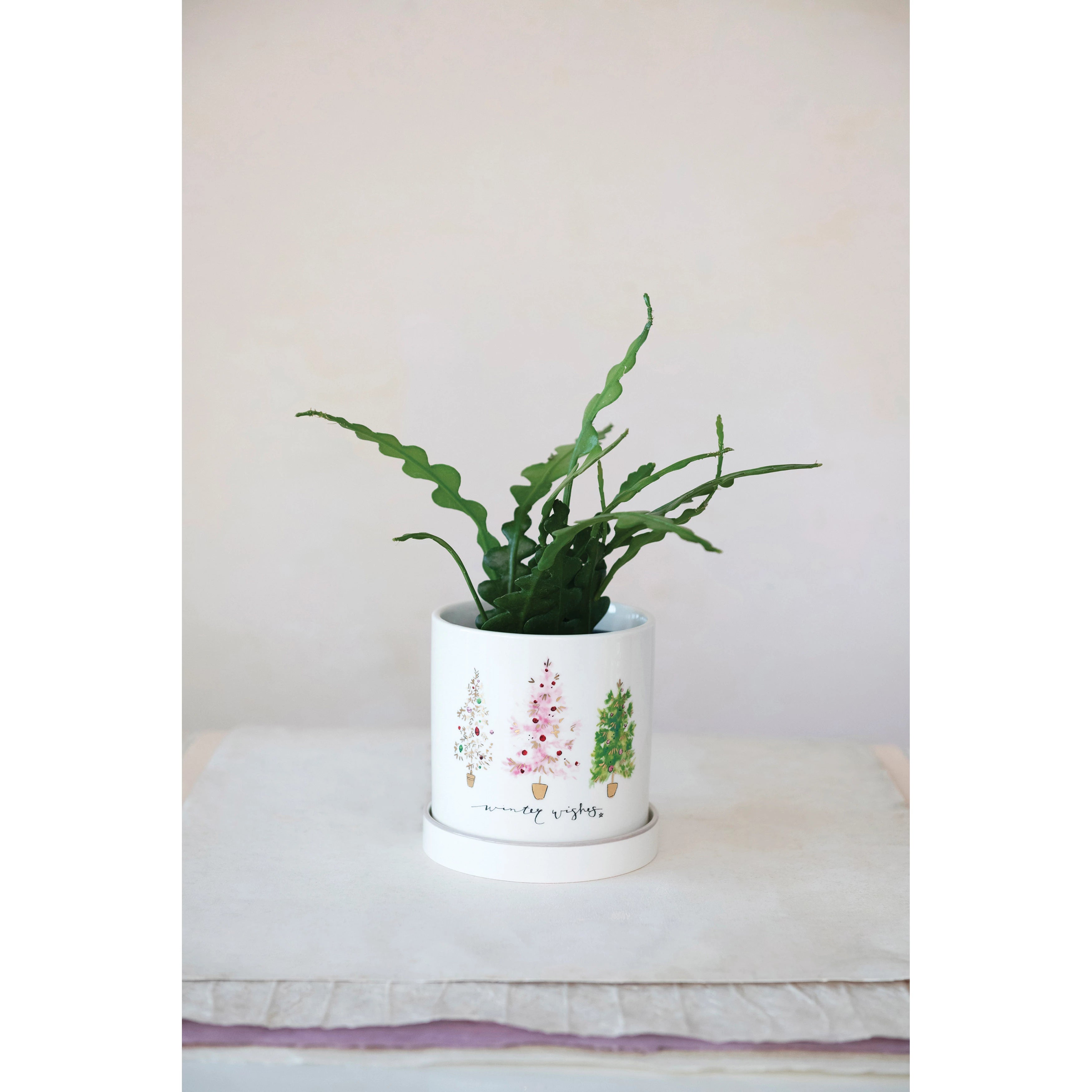 Get ready to deck the halls with this 6-inch round and 6-inch high stoneware planter, complete with a saucer, adorned with potted Christmas trees and a touch of gold electroplating. 'Tis the season for "Winter Wishes" and whimsical planters!